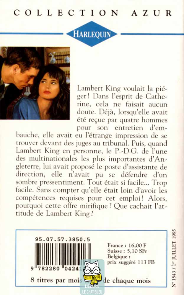 Lambert King voulait la piéger ! Dans l’esprit de Catherine, cela ne faisait aucun doute. Déjà, lorsqu’elle avait été reçue par quatre hommes pour son entretien d’embauche, elle avait eu l’étrange impression de se trouver devant des juges au tribunal. Puis, quand Lambert King en personne, le P.D.G. de l’une des multinationales les plus importantes d’Angleterre, lui avait proposé le poste d’assistante de direction, elle n’avait pu se défendre d’un sombre pressentiment. Tout était si facile… Trop facile. Sans compter qu’elle était loin d’avoir les compétences requises pour cet emploi ! Alors, pourquoi cette offre mirifique ? Que cachait l’attitude de Lambert King ?