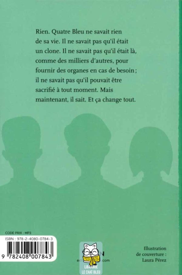 Rien. Quatre Bleu ne savait rien de sa vie. Il ne savait pas qu’il était un clone. Il ne savait pas qu’il était là, comme des milliers d’autres, pour fournir des organes en cas de besoin ; il ne savait pas qu’il pouvait être sacrifié à tout moment. Mais maintenant, il sait. Et ça change tout.