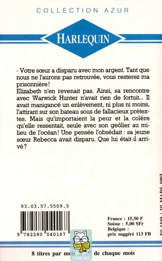 Elizabeth n’en revenait pas. Ainsi, sa rencontre avec Warwick Hunter n’avait rien de fortuit… Il avait manigancé un enlèvement, ni plus ni moins, l’attirant sur son bateau sous de fallacieux prétextes. Mais qu’importaient la peur et la colère qu’elle ressentait, seule avec son geôlier au milieu de l’océan ! Une pensée l’obsédait : sa jeune soeur Rebecca avait disparu. Que lui était-il arrivé ?