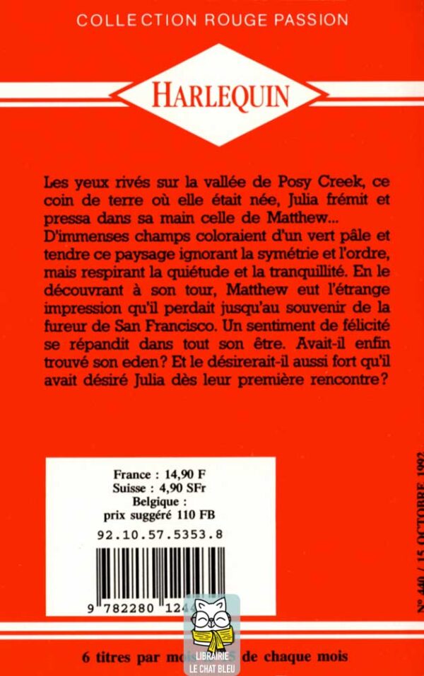 D’immenses champs coloraient d’un vert pâle et tendre ce paysage ignorant la symétrie et l’ordre, mais respirant la quiétude et la tranquillité. En le découvrant à son tour, Matthew eut l’étrange impression qu’il perdait jusqu’au souvenir de la fureur de San Francisco. Un sentiment de félicité se répandit dans tout son être. Avait-il enfin trouvé son Eden ? Et le désirerait-il aussi fort qu’il avait désiré Julia dès leur première rencontre ?