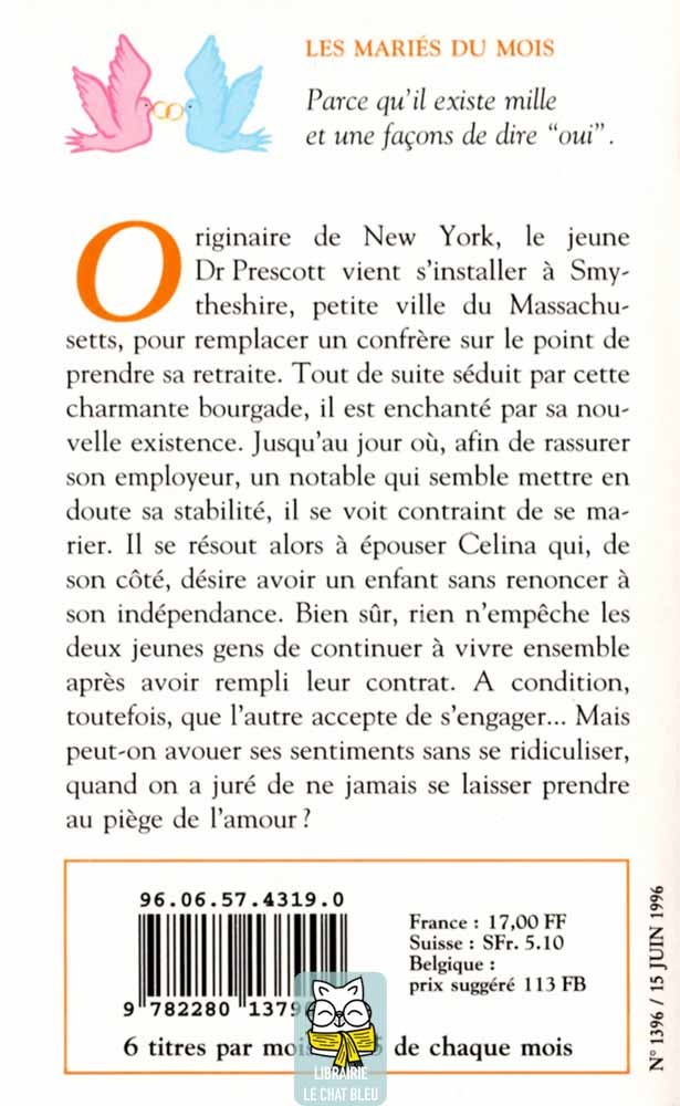 Originaire de New York, le jeune Dr Prescott vient s’installer à Smytheshire, petite ville du Massachusetts, pour remplacer un confrère sur le point de prendre sa retraite. Tout de suite séduit par cette charmante bourgade, il est enchanté par sa nouvelle existence. Jusqu’au jour où, afin de rassurer son employeur, un notable qui semble mettre en doute sa stabilité, il se voit contraint de se marier. Il se résout alors à épouser Celina qui, de son côté, désire avec un enfant sans renoncer à son indépendance. Bien sûr, rien n’empêche les deux jeunes gens de continuer à vivre ensemble après avoir rempli leur contrat. A condition, toutefois, que l’autre accepte de s’engager… Mais peut-on avouer ses sentiments sans se ridiculiser, quand on a juré de ne jamais se laisser prendre au piège de l’amour ?