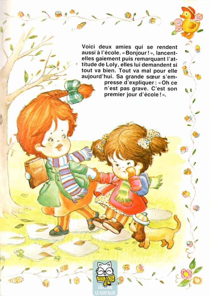 « C’est le premier jour d’école et ce matin, Loly a eu du mal à se lever. D’ailleurs Loly est de bien méchante humeur et ne cesse de pleurnicher sur le chemin de l’école :