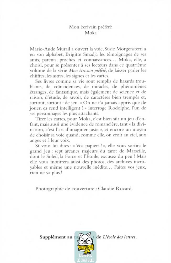 Marie-Aude Murail a ouvert la voie, Susie Morgenstern a eu son alphabet, Brigitte Smadja les témoignages de ses amis, parents, proches et connaissances… Moka, elle, a choisi, pour se présenter à ses lecteurs dans ce quatrième volume de la série Mon écrivain préféré, de laisser parler les chiffres, les astres, les signes et les cartes.
