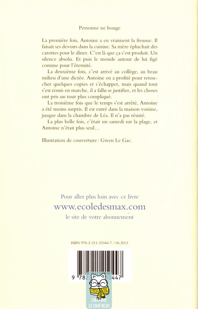 La première fois, Antoine a eu vraiment la frousse. Il faisait ses devoirs dans la cuisine. Sa mère épluchait des carottes pour le dîner. C’est là que ça s’est produit. Un silence absolu. Et puis le monde autour de lui figé comme pour l’éternité. La deuxième fois, c’est arrivé au collège, au beau milieu d’une dictée. Antoine en a profité pour retoucher quelques copies et s’échapper, mais quand tout s’est remis en marche, il a fallu se justifier, et les choses ont pris un tour plus compliqué. La troisième fois que le temps s’est arrêté, Antoine a été moins surpris. Il est entré dans la maison voisine, jusque dans la chambre de Léa. Il n’a pas résisté. La plus belle fois, c’était un samedi sur la plage, et Antoine n’était plus seul…