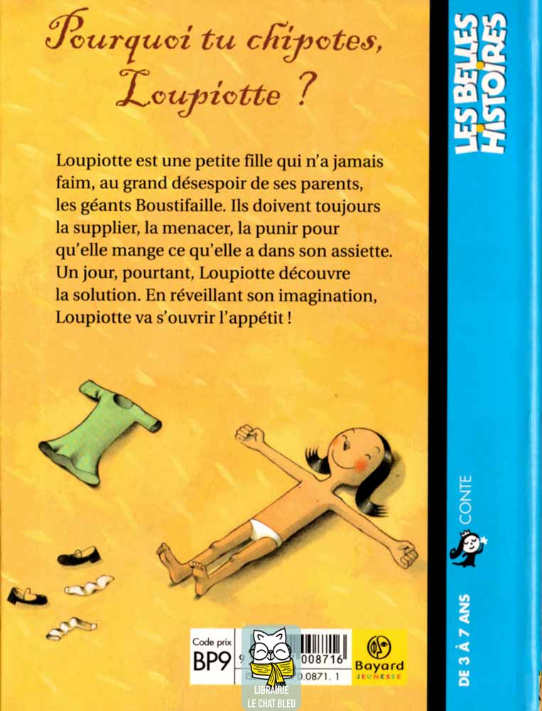 Loupiotte est une petite fille qui n’a jamais faim, au grand désespoir de ses parents, les géants Boustifaille. Ils doivent toujours la supplier, la menacer, la punir pour qu’elle mange ce qu’elle a dans son assiette. Un jour, pourtant, Loupiotte découvre la solution. En réveillant son imagination, Loupiotte va s’ouvrir l’appétit !