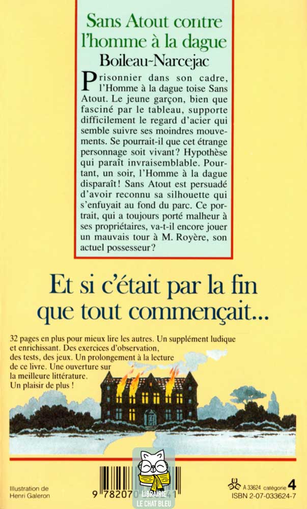 Prisonnier dans son cadre, l’Homme à la dague toise Sans Atout. Le jeune garçon, bien que fasciné par le tableau, supporte difficilement le regard d’acier qui semble suivre ses moindres mouvements. Se pourrait-il que cet étrange personnage soit vivant ? Hypothèse qui paraît invraisemblable. Pourtant, un soir, l’Homme à la dague disparaît ! Sans Atout est persuadé d’avoir reconnu sa silhouette qui s’enfuyait au fond du parc. Ce portrait, qui a toujours porté malheur à ses propriétaires, va-t-il encore jouer un mauvais tour à M. Royère, son actuel possesseur ?
