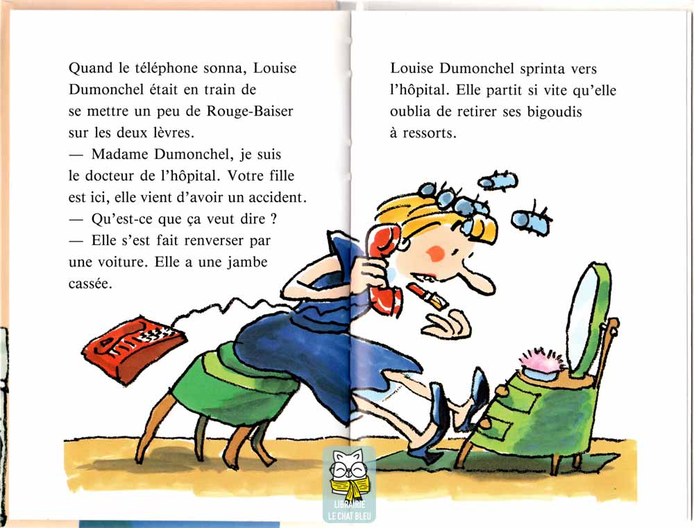 Dans la rue, Marie-Anne écoute de la musique sur son baladeur, lit et, en plus, se récite un poème. Évidemment, elle traverse sans regarder… et bing ! en route pour l’hôpital, bonjour le plâtre blanc comme neige autour de la jambe prisonnière !